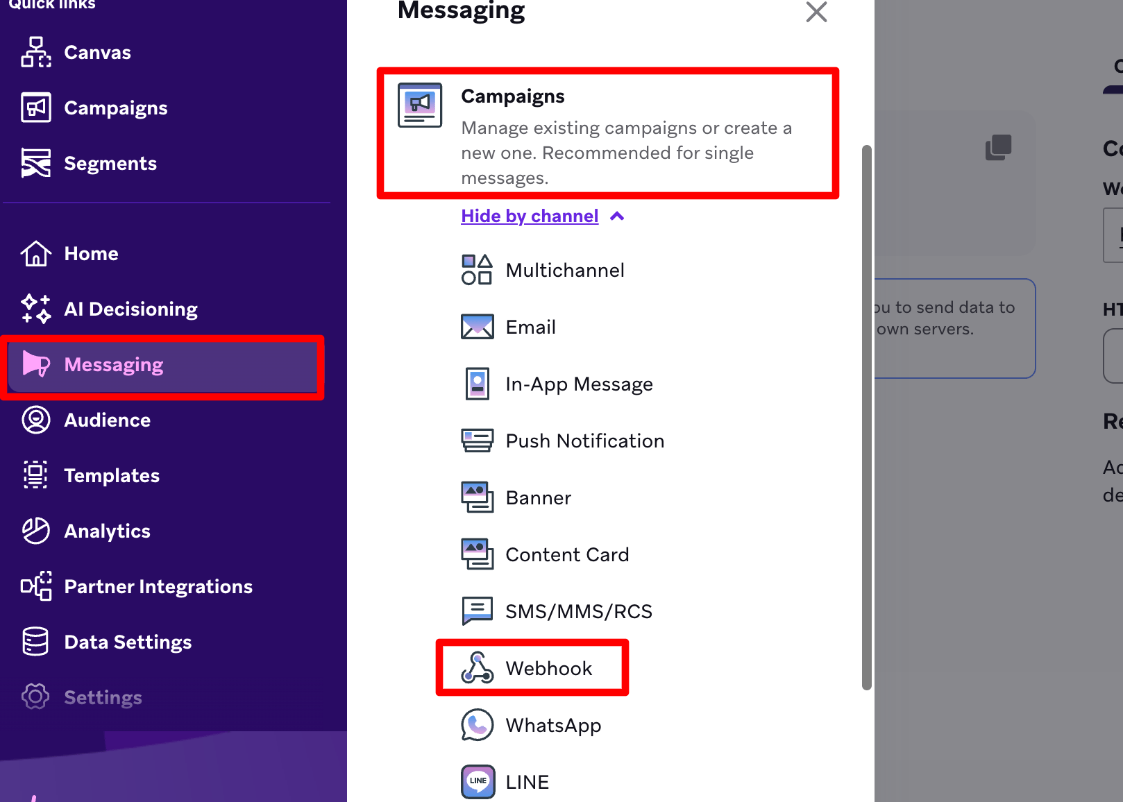 Go to Messaging → Campaigns → Create Webhook (or just add a Webhook step inside a Canvas).